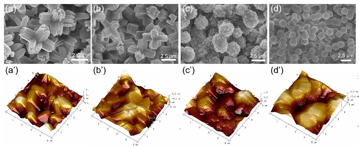 图2.不同2-MIM/Zn (II)比(α) α=8,(b) α= 15,(c) α= 30 (d) α=40)的PDA-PEI/ZIF-L@PE膜的SEM图像和相应的AFM图像(a′-d′)。