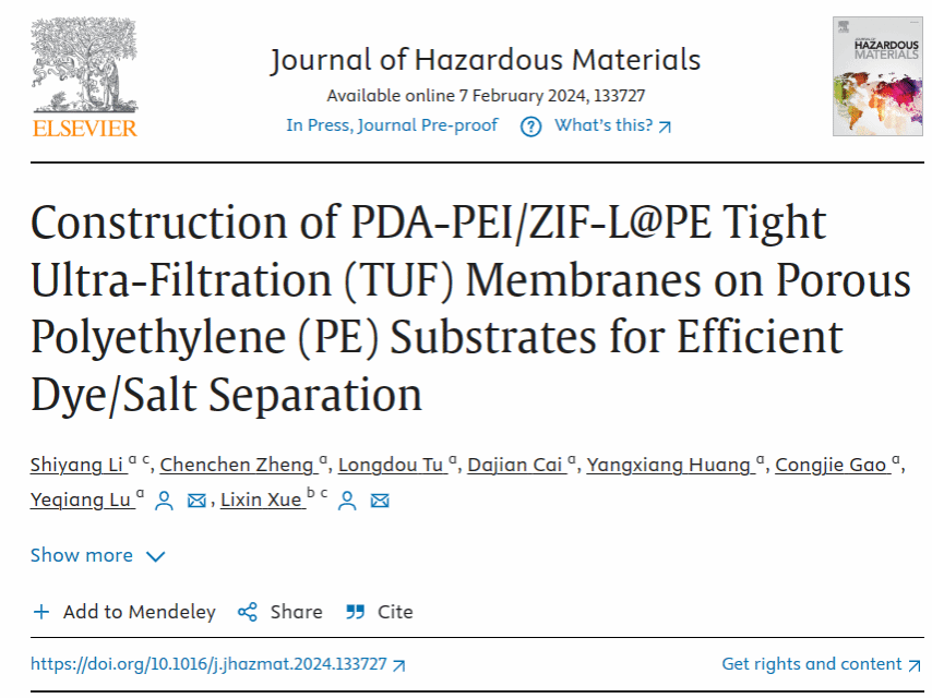 文章链接:“Construction of PDA-PEI/ZIF-L@PE Tight Ultra-Filtration (TUF) Membranes on Porous Polyethylene (PE) Substrates for Efficient Dye/Salt Separation”