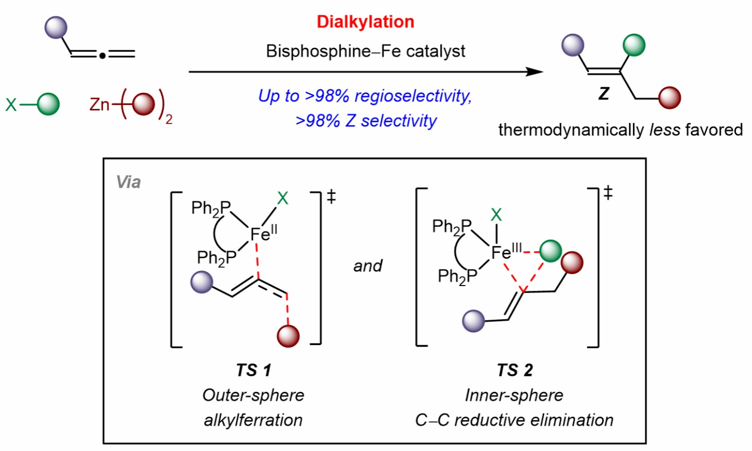 近日,我校钱鹏程教授课题组与新加坡国立大学Ming Joo Koh教授课题组,香港中文大学章兴龙助理教授合作报道了铁催化联烯、二烷基锌化合物和卤代烷烃的多组分反应,以优异的区域选择性和Z-选择性构建了一系列三取代烯烃,包括葡萄糖神经酰胺合成酶(GCS)抑制剂。机理研究表明该反应是由动力学控制的(即自由基介导位阻较小C=C键的铁烷基化和通过还原消除进行的内球烷基化),这与金属催化联烯官能团化反应的传统机制形成鲜明对比。