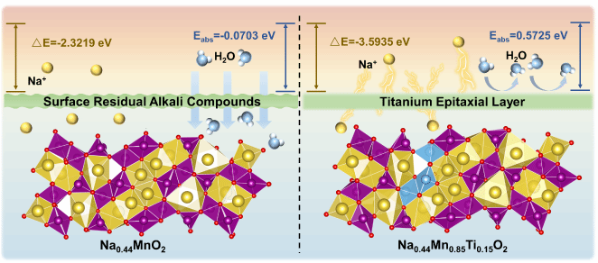 Na0.44MnO2作为钠离子电池隧道型氧化物最典型的材料,它具有独特的S形通道,有利于Na+的快速脱出和嵌入,并表现出较为优异的空气/水稳定性。然而,Na0.44MnO2仍存在以下问题:1)Na+/H+离子交换导致表面残碱较高,会引起正极浆料凝胶化,损害其电化学性能;2)充放电曲线中存在多个电压平台,对动力学行为产生不利影响;3)Na0.44MnO2的钠化学计量比低,不适合与未预钠化的硬碳负极进行全电池匹配,需要一种策略来补偿在SEI形成过程中损失的钠。