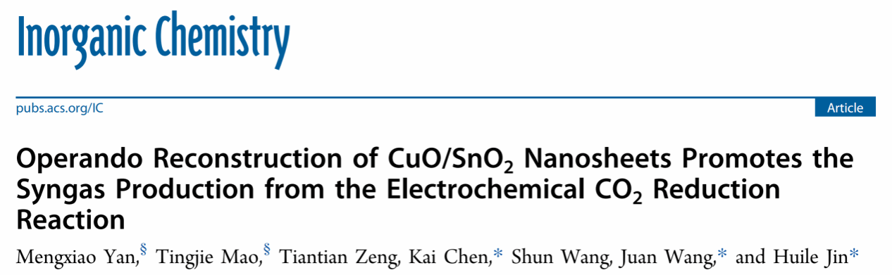 该研究结果以“Operando Reconstruction of CuO/SnO2 Nanosheets Promotes the Syngas Production from the Electrochemical CO2 Reduction Reaction”为题发表在国际权威期刊《》,温州大学作为第一通讯单位,我院2023级研究生颜梦晓和2024级博士生毛挺杰为文章的共同第一作者,我院陈凯副教授,王娟副教授和金辉乐研究员为共同通讯作者。