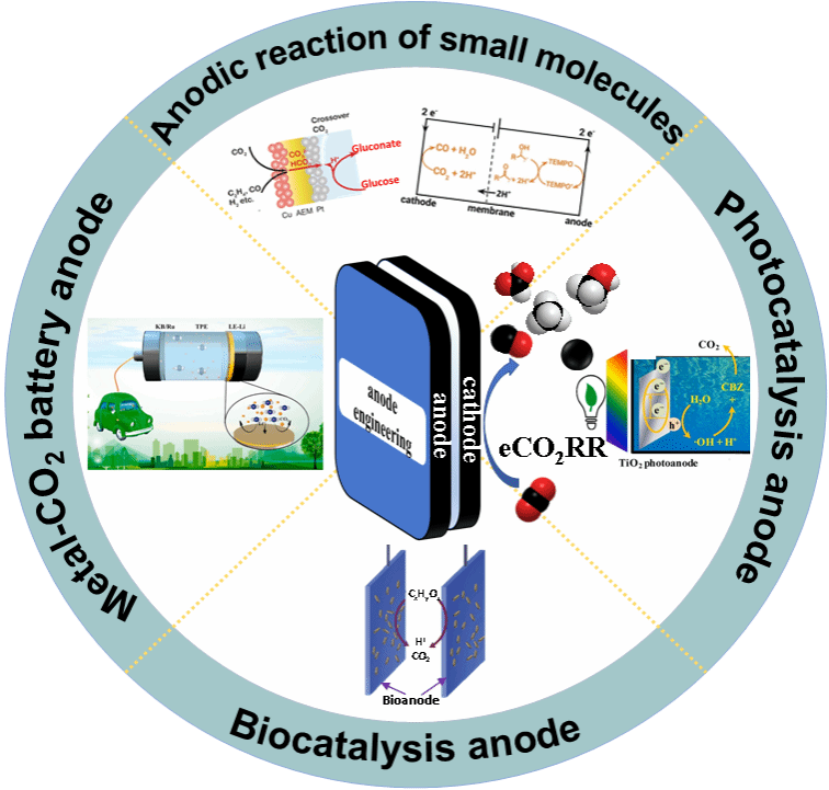 电催化二氧化碳还原反应(eCO2RR)在生产高附加值化学品和实现碳中和方面展现出巨大潜力。然而,在这项技术广泛应用于工业之前,仍有许多挑战或瓶颈问题需要解决。特别是,阳极在eCO2RR过程中扮演着至关重要的角色,决定了整个电解槽的性能和稳定性。近年来,从高能耗的阳极氧气析出反应(OER)向增值氧化反应的战略转变,显著提高了能源效率并促进了更多增值化学品的生产。此外,采用外部辅助的阳极,例如光阳极和微生物阳极,标志着二氧化碳转化和可持续能源生产的重要突破。这些进步有助于摆脱仅依赖电力输入的局限,加速可再生资源向电力和工业原料的转化进程。此外,金属-CO2电池已经成为一种独特而有效的CO2利用方式,提供了CO2转化和发电的双重优势。
