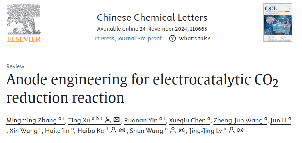 该成果以“Anode engineering for electrocatalytic CO2 reduction reaction”为题发表在Chinese Chemical Letters期刊(IF=9.4,SCI一区)上。温州大学为第一通讯单位,我院研究生张明茗、尹若楠为共同第一作者,松山湖材料实验室柯海波教授与我校徐婷博士后、王舜教授和吕晶晶教授为共同通讯作者。