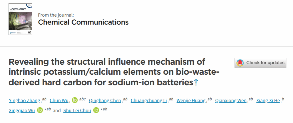 该成果以“Revealing the structural influence mechanism of intrinsic potassium/calcium elements on bio-waste-derived hard carbon for sodium-ion batteries”为题,发表在Chemical Communications上。我院2022级硕士生张颖豪为论文第一作者,侴术雷教授、吴星樵博士为该论文共同通讯作者,温州大学为第一通讯单位。相关工作受到国家自然科学基金、浙江省自然科学基金、温州市自然科学基金等资助。