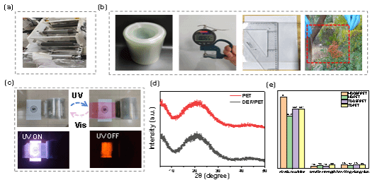 光照变色材料需要宽松的主体环境以实现光化学反应时的分子构型变化,室温磷光材料需要刚性的主体环境以抑制激子的非辐射跃迁,因此两者很难兼容。作者通过设计光致变色活性高、构型变化小兼具磷光性质的客体分子,以刚性程度适中的PET为主体,实现了光致变色和室温磷光性质的罕见共存。最后,作者们成功制备了透明均匀的薄膜,其长度达200米,宽度为20厘米,厚度仅为60-70微米。该薄膜表现出优异的热稳定性、灵敏度以及抗光疲劳性能,表明其在工业生产中具有广泛的应用潜力。