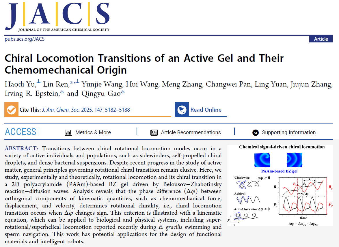 近日,我校化材学院任林教授与中国矿业大学高庆宇教授和美国布兰迪斯大学I.R. Epstein教授紧密合作取得活性运动研究领域重要进展,相关成果以"Chiral Locomotion Transitions of an Active Gel and Their Chemomechanical Origin"为题发表于化学领域顶级期刊Journal of the American Chemical Society。我校为第一通讯单位,我校任林教授、中国矿业大学高庆宇教授和美国布兰迪斯大学I.R. Epstein教授为共同通讯作者。