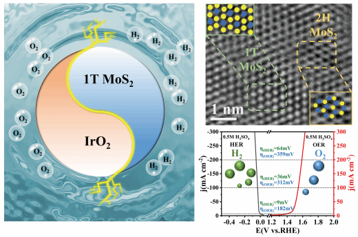 近日,我院杨植教授、周学梅博士联合西北工业大学高唯博士通过相工程调控策略,制备了IrO2/MoS2/CNT异质结催化剂。通过将IrO2掺入到MoS2/CNT,诱导MoS2从2H相部分相变1T相,显著提升了催化剂的导电性和催化活性。碳纳米管(CNT)的加入进一步增强了催化剂的导电性和结构稳定性。结果表明,在酸性环境下,IrO2/MoS2/CNT催化剂表现出卓越的全电解水催化性能。通过多种原位实验和DFT计算等手段系统揭示了其电解水催化性能增强的原因。