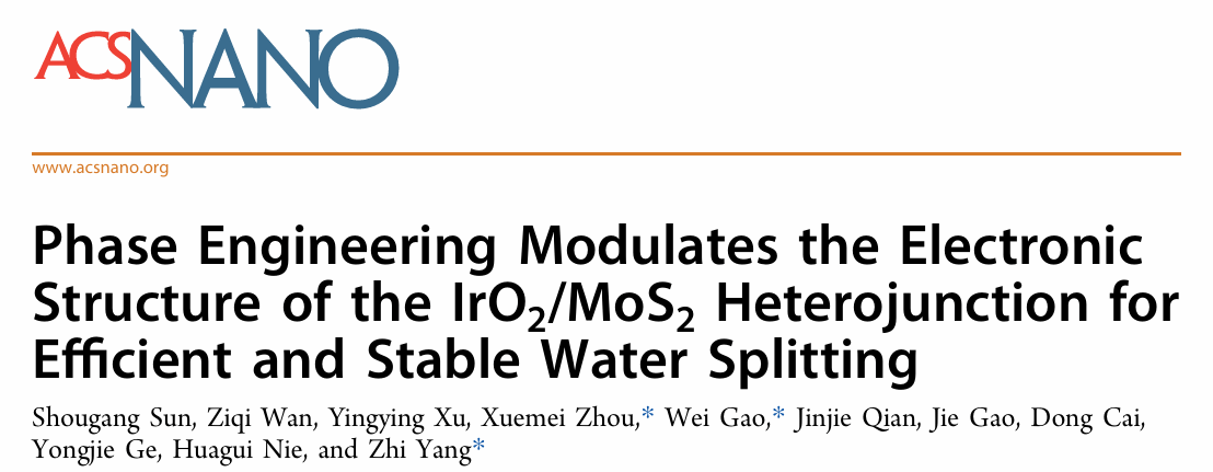 相关研究结果以“Phase Engineering Modulates the Electronic Structure of the IrO2/MoS2 Heterojunction for Efficient and Stable Water Splitting”为题发表在国际知名期刊《ACS Nano》上,温州大学为第一通讯单位,我院2022级硕士研究生孙守刚为第一作者,我院杨植教授、周学梅博士和西北工业大学高唯博士为该论文共同通讯作者,相关工作受到国家自然科学基金(22109119)和浙江省自然科学基金(LQ24B030009)等项目的资助。