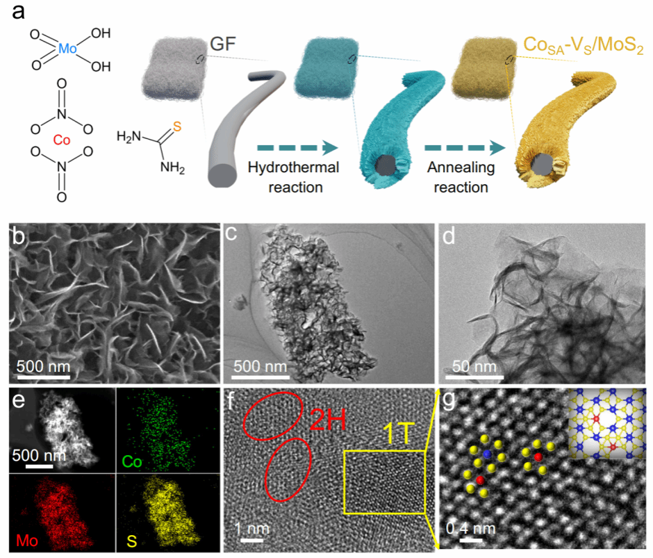 针对这一挑战,我校化学与材料工程学院孟格副研究员团队与广西大学刘熙俊教授、清华大学王定胜教授、兰州交通大学褚克教授等合作,创新性地设计了一种硫空位修饰的钴单原子掺杂二硫化钼催化剂(CoSA-VS/MoS2),首次揭示了单原子与硫空位的协同作用机制,为高性能聚硫化物-碘化物液流电池(SIRFB)的开发提供了全新策略。研究通过原位实验与理论计算证明,钴单原子的引入诱导MoS2发生2H→1T相变并产生丰富硫空位,协同优化了反应中间体的吸附能力与电荷传输动力学,显著提升了电池性能。该研究不仅为单原子催化剂在液流电池中的应用开辟了新方向,还通过精准调控催化剂缺陷与电子结构,为多电子转移反应体系的设计提供了普适性策略。所开发的SIRFB技术有望推动可再生能源电网的高效集成,助力“双碳”目标实现。