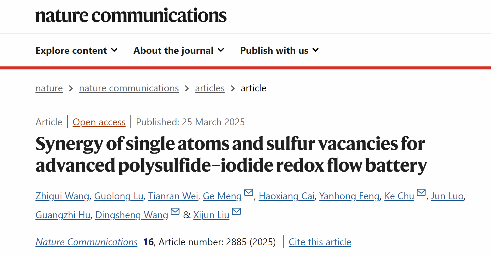 该成果以“Synergy of single atoms and sulfur vacancies for advanced polysulfide–iodide redox flow battery”为题,于2025年3月25日在线发表于国际顶级期刊《Nature Communications》(DOI: 10.1038/s41467-025-58273-9)。我校为第一通讯单位,孟格、褚克、王定胜、刘熙俊为共同通讯作者。