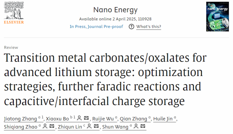 该成果以“Transition metal carbonates/oxalates for advanced lithium storage: optimization strategies, further faradic reactions and capacitive/interfacial charge storage”为题发表在国际能源类顶级期刊《Nano Energy》上。温州大学为第一通讯单位,我院2022级硕士生张嘉桐为第一作者,我校赵世强副教授和王舜教授、温州科技职业学院薄晓旭博士、新加坡国立大学林志群教授为共同通讯作者。相关研究工作受到国家自然科学基金(21905208、52331009)、浙江省自然科学基金(LY23B030001)和温州市基础科研项目(G20240025)的资助。