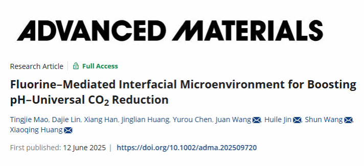 近日,我校化材学院校王舜/金辉乐/王娟团队以及厦门大学黄小青教授在国际顶级期刊《Advanced Materials》发表题为“Fluorine–Mediated Interfacial Microenvironment for Boosting pH–Universal CO2 Reduction.”的学术论文。在这项工作中,使用缺陷辅助策略成功的将镍物种(单原子和原子簇)锚定在氟碳基材(FC)上,通过构建单原子耦合原子团簇策略制备得到了高效稳定的CO2RR电催化剂,优化后的Ni/FC在酸性、中性和碱性电解质中表现出优异的FECO,分别为92.0%、99.1%和98.8%。相反,当F元素不存在时,HER过程占主导地位。更重要的是,Ni/FC可以在宽pH范围内保持优异的FECO。值得注意,在工业电流密度(200 mA cm-2)下能稳定运行3000小时,明显优于最近在不同电解质条件下报道的电催化剂。结合密度泛函理论(DFT)计算、原位红外光谱(ATR-FTIR)以及原位增强拉曼测试表征全面揭示了引入F后FECO增强和FEH2抑制的内在原因:F的高电负性将导致正Cδ+中心的形成,这会抑制氢的吸附,提高界面水的离解能垒,从而抑制竞争性HER过程(即正电碳Cδ+中心能够 “隔离”质子,抑制HER)。同时,气-固-液界面处产生的局部微环境有利于降低速率决定步骤(RDS)的能量势垒,从而促进CO2转化为CO。