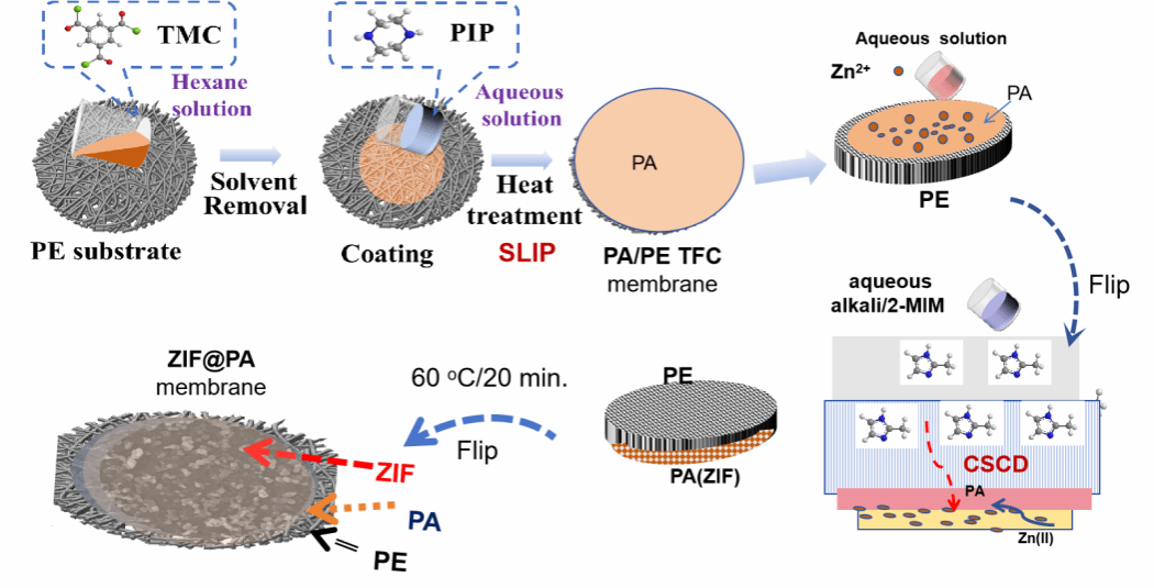 鉴于此,我院薛立新研究员,在国际知名的期刊 Materials Science for Energy Technologies上发表题为“Superior polyethylene based total heat exchange membranes made from sealing polyamide separating layers with in situ grown ZIF-8 particles”的研究论文。该研究为了提高聚酰胺(PA)/聚乙烯(PE)基薄膜复合材料(TFC)全热交换膜(THEMS)的性能,开发了Zn(II)溶液和2-甲基咪唑(2-MIM)-氨溶液(pH=10)之间的跨基底反向扩散(CSCD)过程,原位生长ZIF-8颗粒。来自CSCD工艺的原位生长的ZIF颗粒通过密封缺陷点有效地阻止了穿过PA分离层的CO2泄漏,并提供了选择性的水蒸气渗透通道和表面积以提高能量回收效率。系统研究了Zn(II)负载量、CSCD反应时间和配体种类对材料结构、CO2阻隔性能和热交换效率的影响。在优化条件下,ZIF-8颗粒封孔可使CO2渗透率从7.5GPU降低到1.15GPU,显热、潜热和热交换效率分别从80%、53%、68%提高到96%、73%和82%。