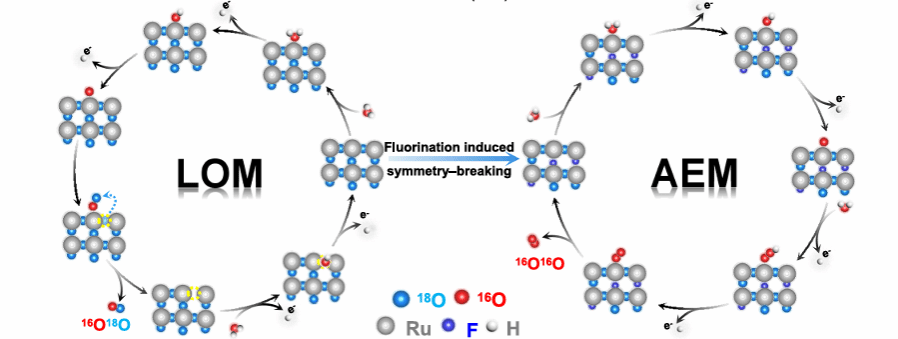 近日,我校王娟/金辉乐/王舜团队在国际顶级期刊《Nature Communications》发表题为“Durable acidic water oxidation ruthenium based electrocatalyst by fluorination induced symmetry breaking”的论文。在这项工作中,通过DFT计算预测了一种高效酸性OER电催化剂,该催化剂通过F取代RuO2中部分O原子来打破八面体构型的对称性,从而实现反应路径的切换。其中,对氧物种吸附能力的改善和脱金属过程的削弱,显著提升了催化剂的OER本征活性和抗溶解能力。实验表明,在酸性条件下,F–RuO2/FC仅需192、243和296 mV过电位即可分别达到10、50和100 mA cm–2的电流密度。更重要的是,在PEMWE中,1.58、1.70、1.89和2.05 V的电压可分别驱动500、1000、2000和3000 mA cm–2的电流密度,并能在100、500及1000 mA cm–2的电流密度下持续稳定运行两个月。原位实验证实,F诱导的对称性破缺确保了RuO2在OER过程中的结构稳定性,并将其反应机制从传统的LOM转变为AEM,从而显著增强了稳定性。