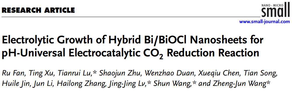 该成果以“Electrolytic growth of hybrid Bi/BiOCl nanosheets for pH-universal electrocatalytic CO2 reduction reaction”为题发表在Small期刊(IF=12.1)上。温州大学为第一通讯单位,我校化材学院2023级硕士生范茹为第一作者,我校2021级硕士生陆天睿、吕晶晶教授、王正军博士、王舜教授为共同通讯作者,相关工作受到国家自然科学基金、浙江省自然科学基金等基金的资助。