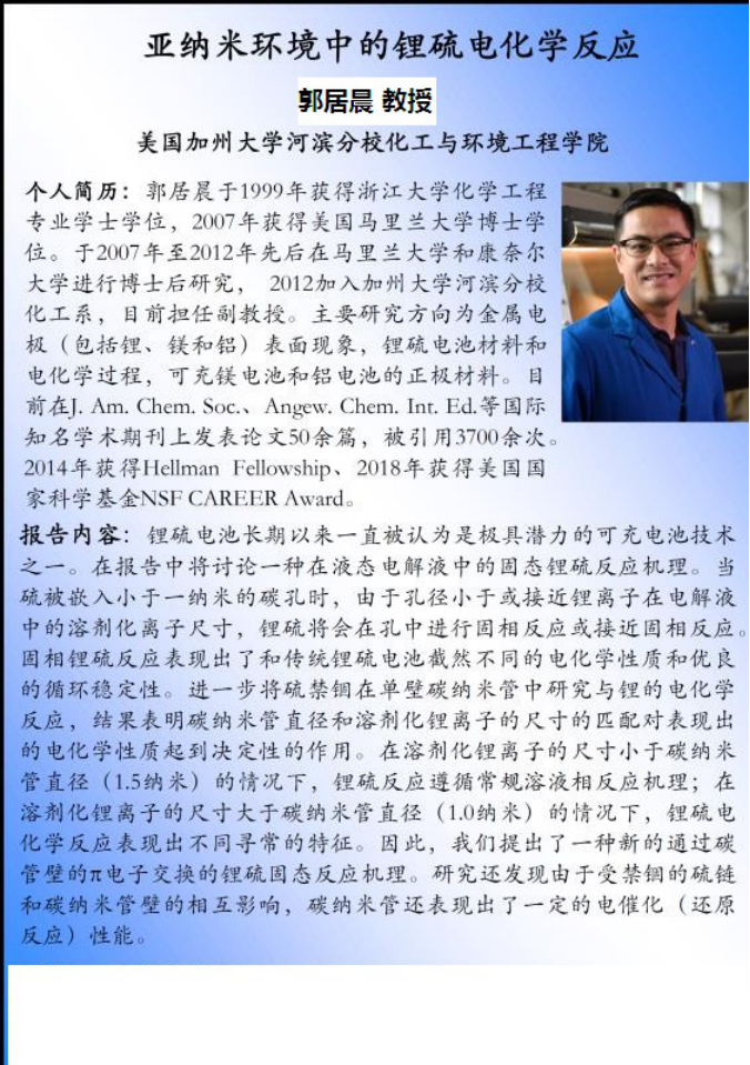 报告题目:亚纳米环境中的锂硫电化学反应