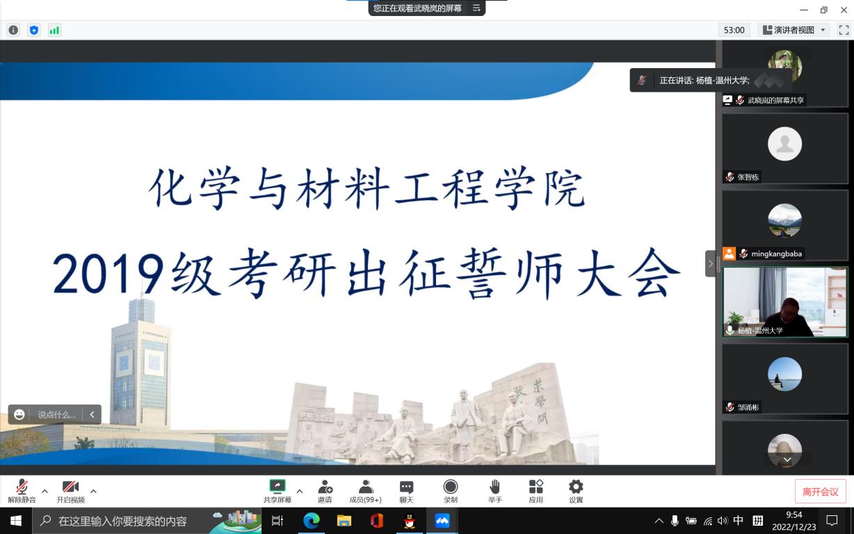 2022年12月23日上午,化学与材料工程学院2023届考研出征誓师大会在线上举行。学院领导班子、各系主任、2019级班主任、学生科辅导员以及全体2023届考研学子参加本次誓师大会。