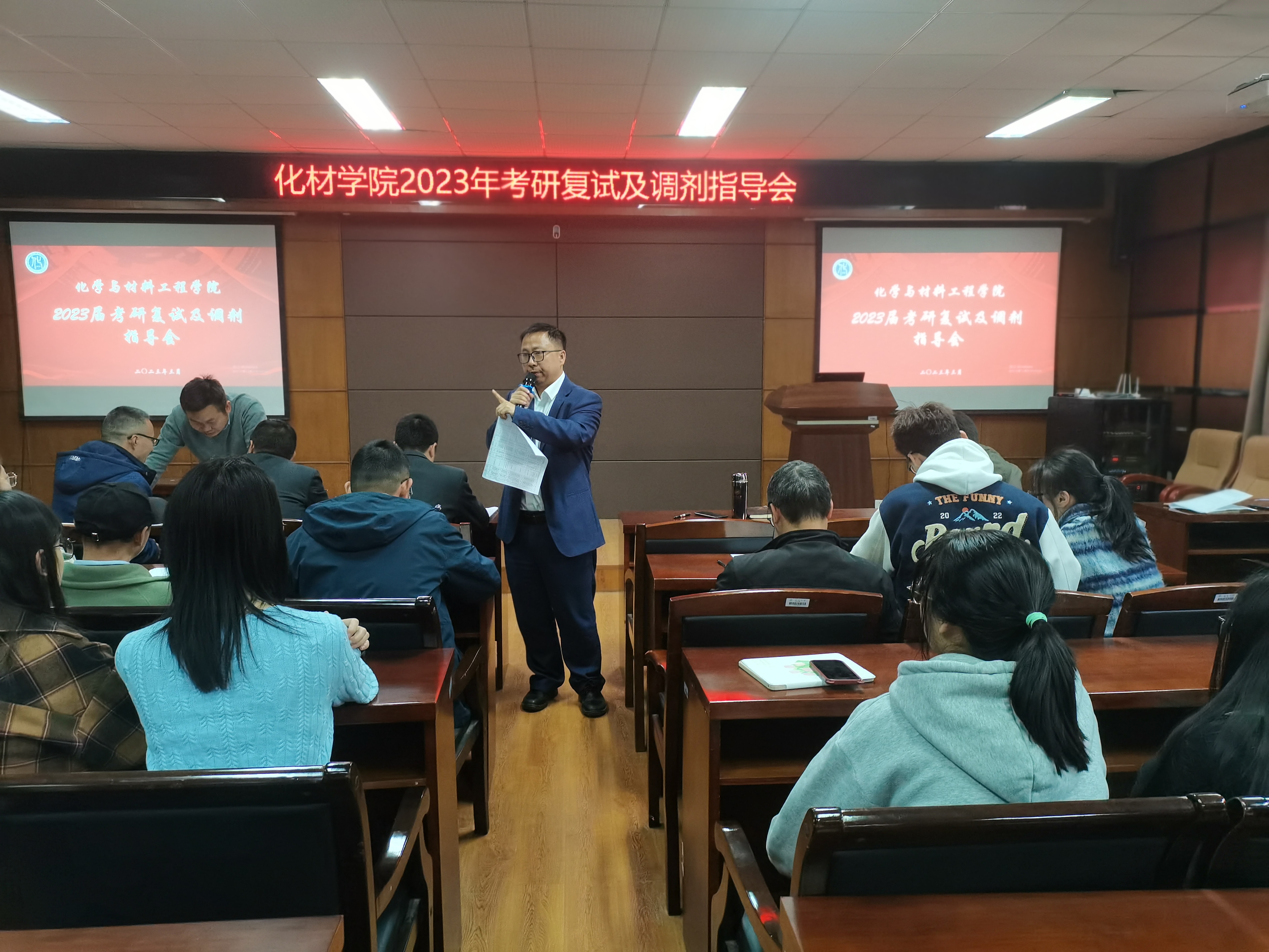 会议伊始,周敬业副书记简要介绍了2023届同学考研的基本情况,周书记肯定了同学们近一年为考研作的努力,分析了今年的考研形势,提醒同学们不因为自己分数高而掉以轻心,也不因为自己分数低自怨自艾放弃调剂,所有同学都应该以积极的心态备战复试。