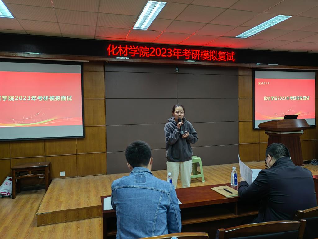 本次大会,邀请了4位2019级化学师范(创新)班的同学作为模拟学生。首先,各位模拟的同学依次上台,分别介绍自己报考院校的复试要求,并按照复试要求进行现场模拟;其次,各位专家结合学生面试情况进行现场指导,同时结合复试中常见的问题、学生考取不同专业、院校的特点进行分析,对学生面试中存在的问题进行耐心指导与解答。最后,现场的同学就自己复试准备中存在的问题与现场导师进行交流。