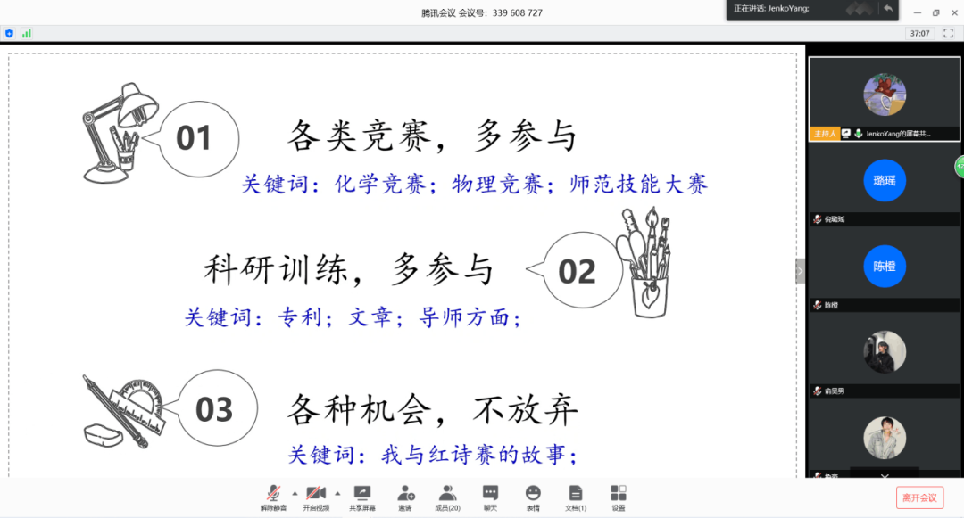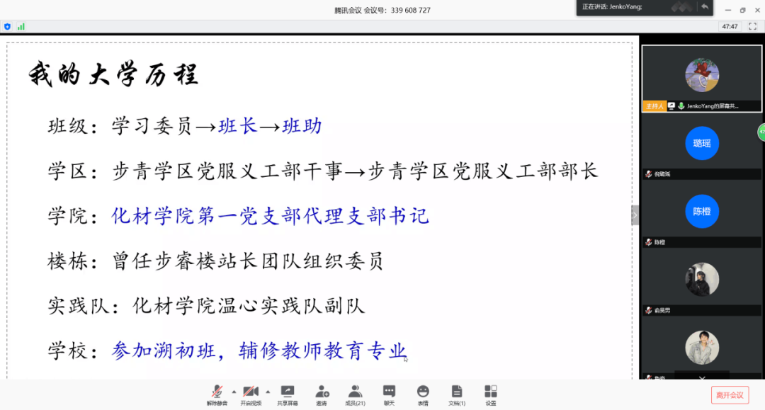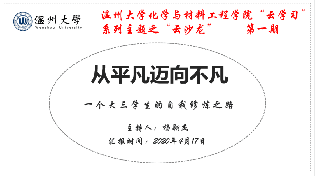 2020年4月17日晚七点,在腾讯会议开展了温州大学化学与材料工程学院第一期 “云”沙龙活动。本次“云”沙龙的主题为“从平凡迈向不凡——一个大三学生的自我修炼之路”,主讲人是来自17化学创新的杨翱杰。