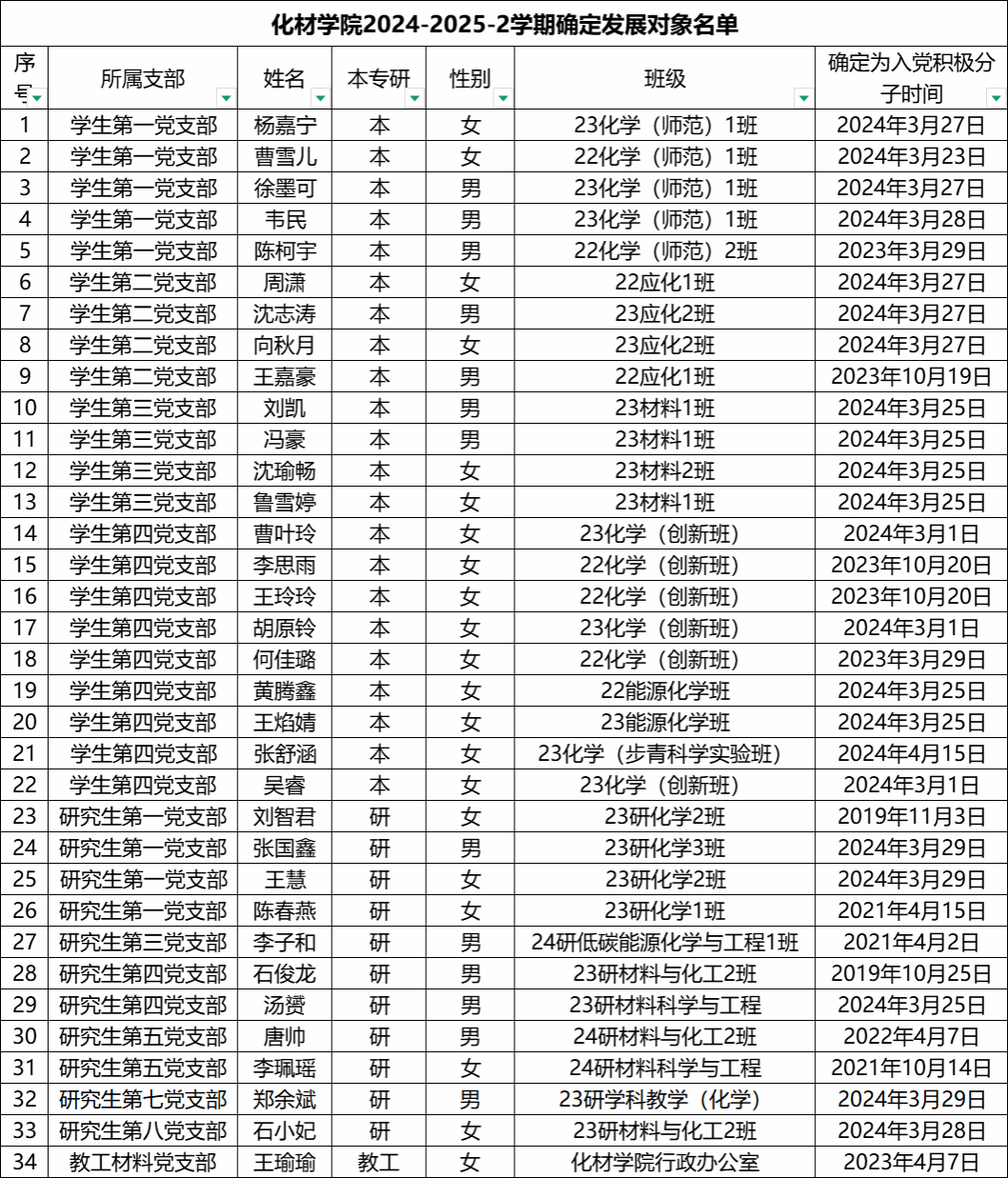 经本人申请,党组织一年以上的培养教育和考察,各支部于近期组织发展对象公开答辩,并征求党员、群众和培养联系人意见,召开支部大会讨论研究,拟确定杨嘉宁等34名入党积极分子为党员发展对象。为增强发展党员工作的透明度,接受党内外群众监督,确保发展党员的质量,根据《中国共产党章程》和《中国共产党发展党员工作细则》的相关规定,现将拟发展对象的基本情况进行公示: