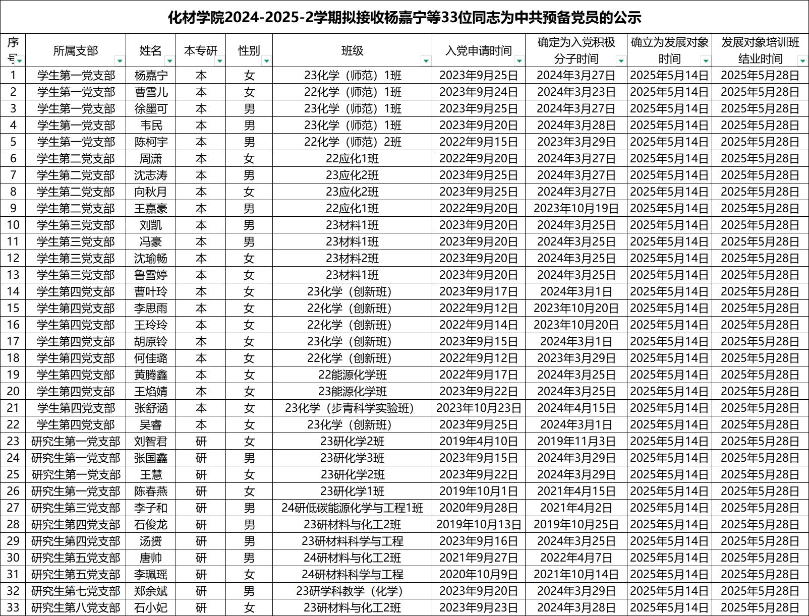 根据《中国共产党发展党员工作细则》,经党支部培养教育和考察,在听取党支部、党员和群众意见的基础上,经研究决定,拟将杨嘉宁等33位同志接收为中共预备党员,并于近期召开支部大会讨论其接收问题。名单公示如下: